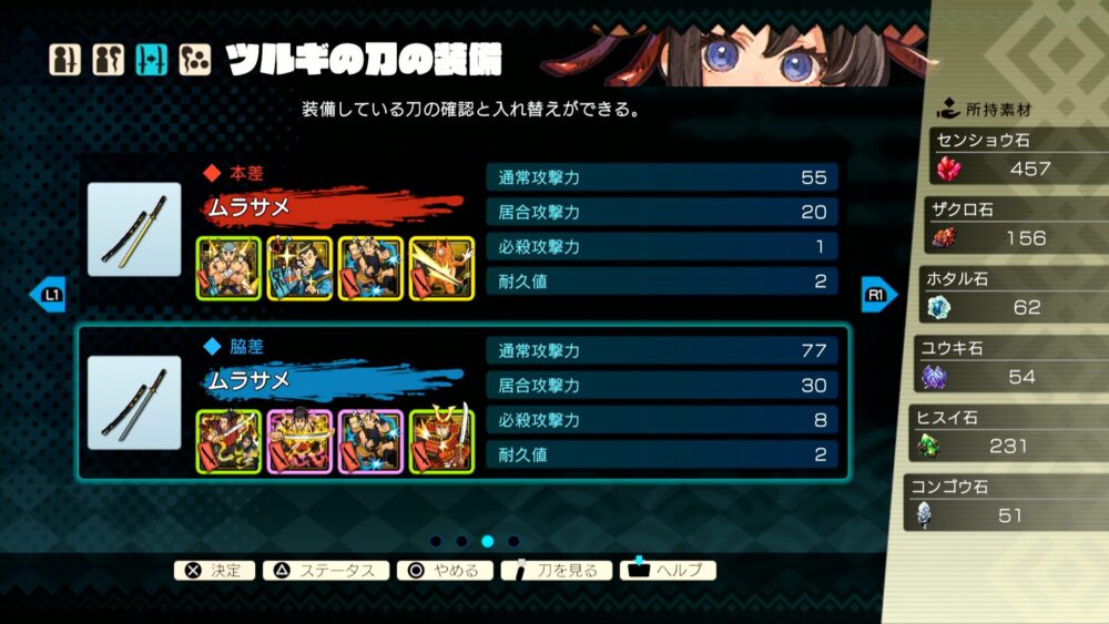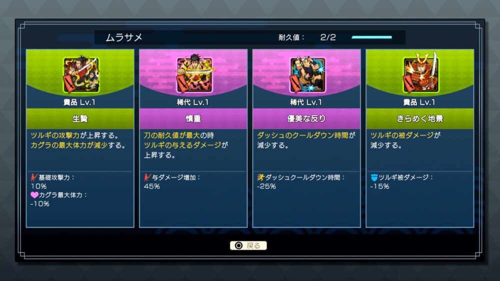 攻撃全振り+脇差+「砥水」構成を軸に、ダッシュ回避とチャージ攻撃で戦うのが最強ルート。