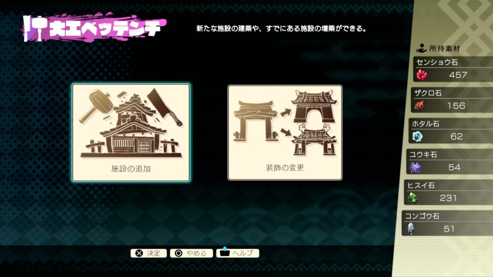 - 強化施設を確認(大工・シンジュ大社・道場・レイメイの塔・刀鍛冶)